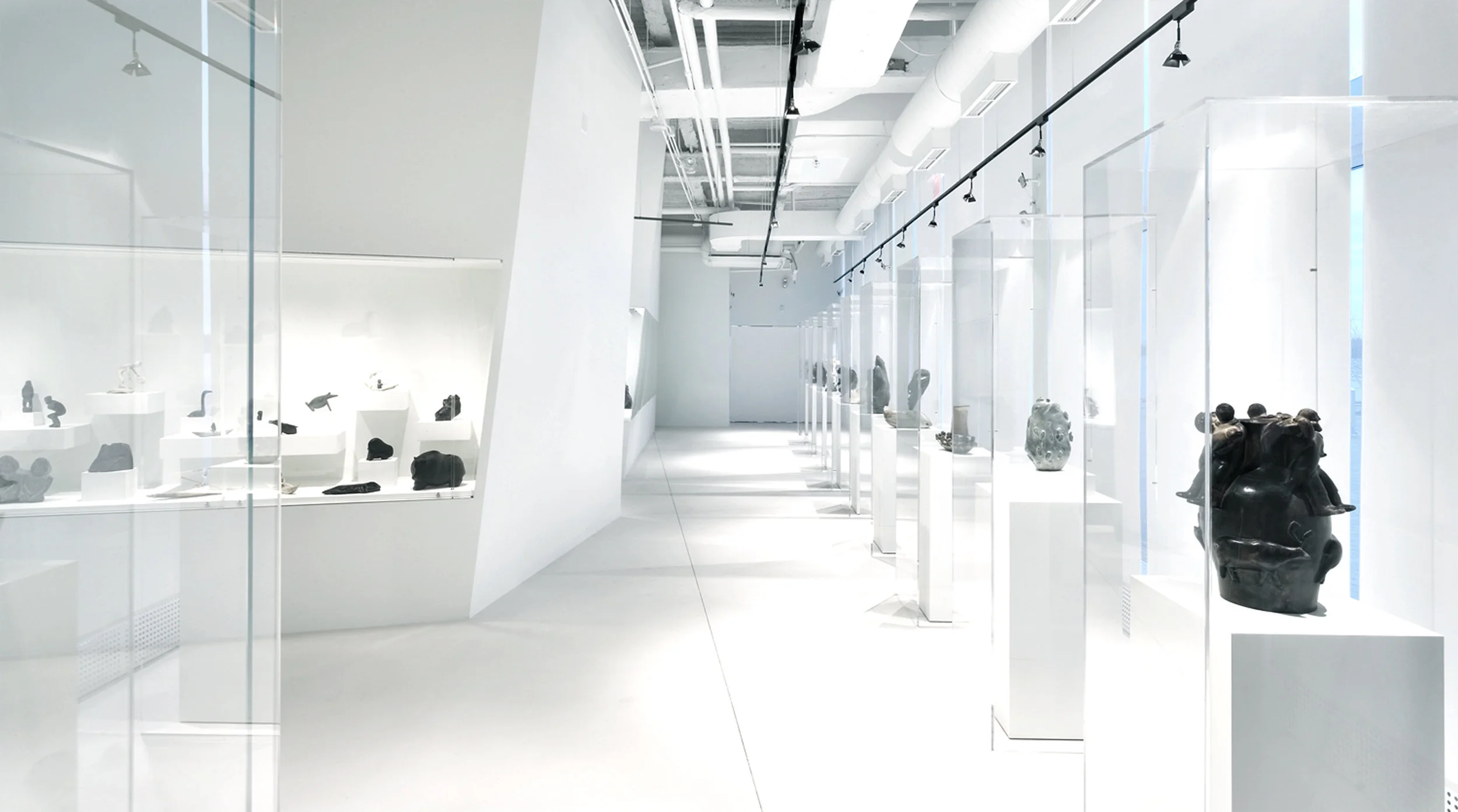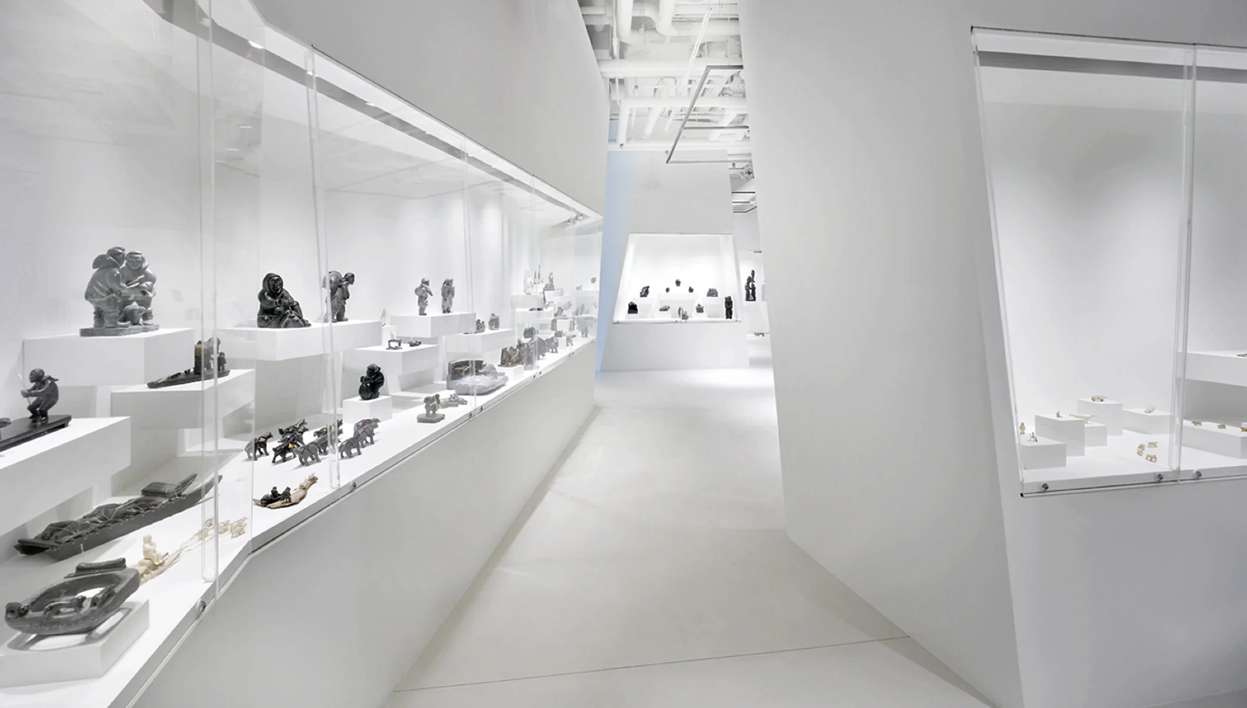 The museum is organized around 7 galleries, which are delineated by four irregularly shaped partitions. The partitions, which also hold displays, run floor to ceiling and are constructed of metal studs and drywall. Canted in plan and section these wall forms are meant to evoke the iconic landscape form of the arctic ice. In contrast, the perimeter of the museum is rigorously orthogonal with display blocks/shelves cantilevered behind full height sliding glass panels. The construction of the display shelves, protective glass enclosures, and pedestals are intentionally minimal to provide a contrasting but neutral backdrop to the art.