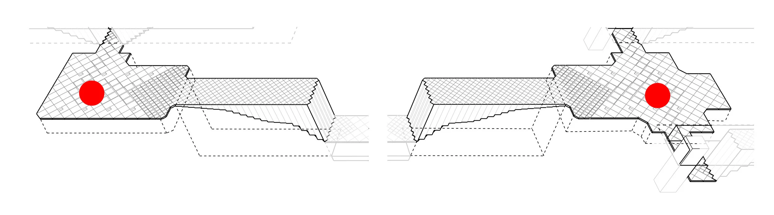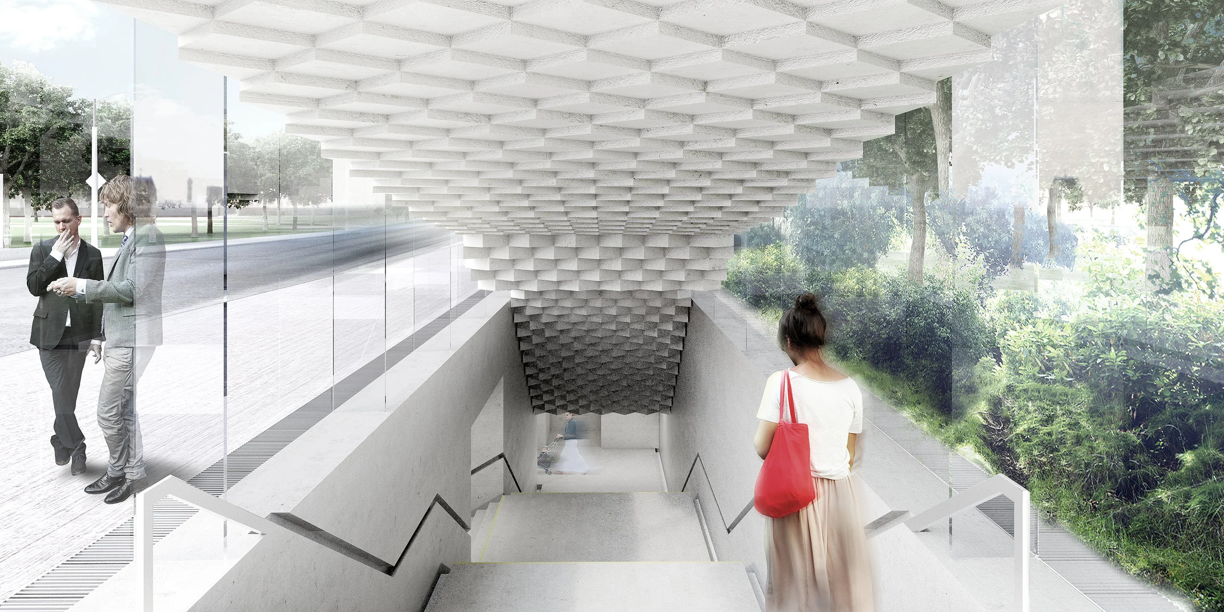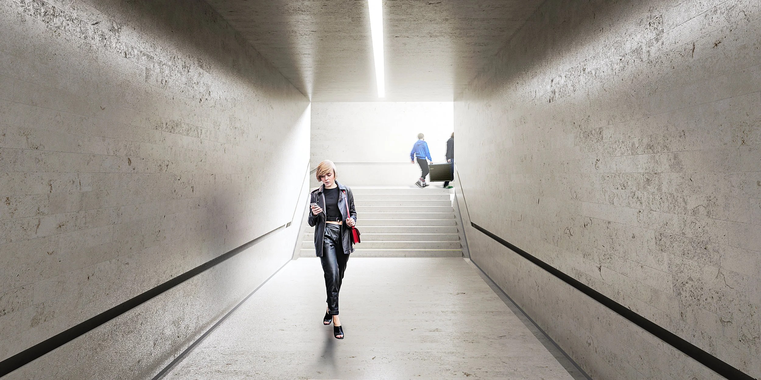 Infused with natural light from the pavilions above, the polished stone walls, ceiling and floor of the street underpass flicker with subtle reflections, ensuring a sense of comfort, safety and seamless connection.