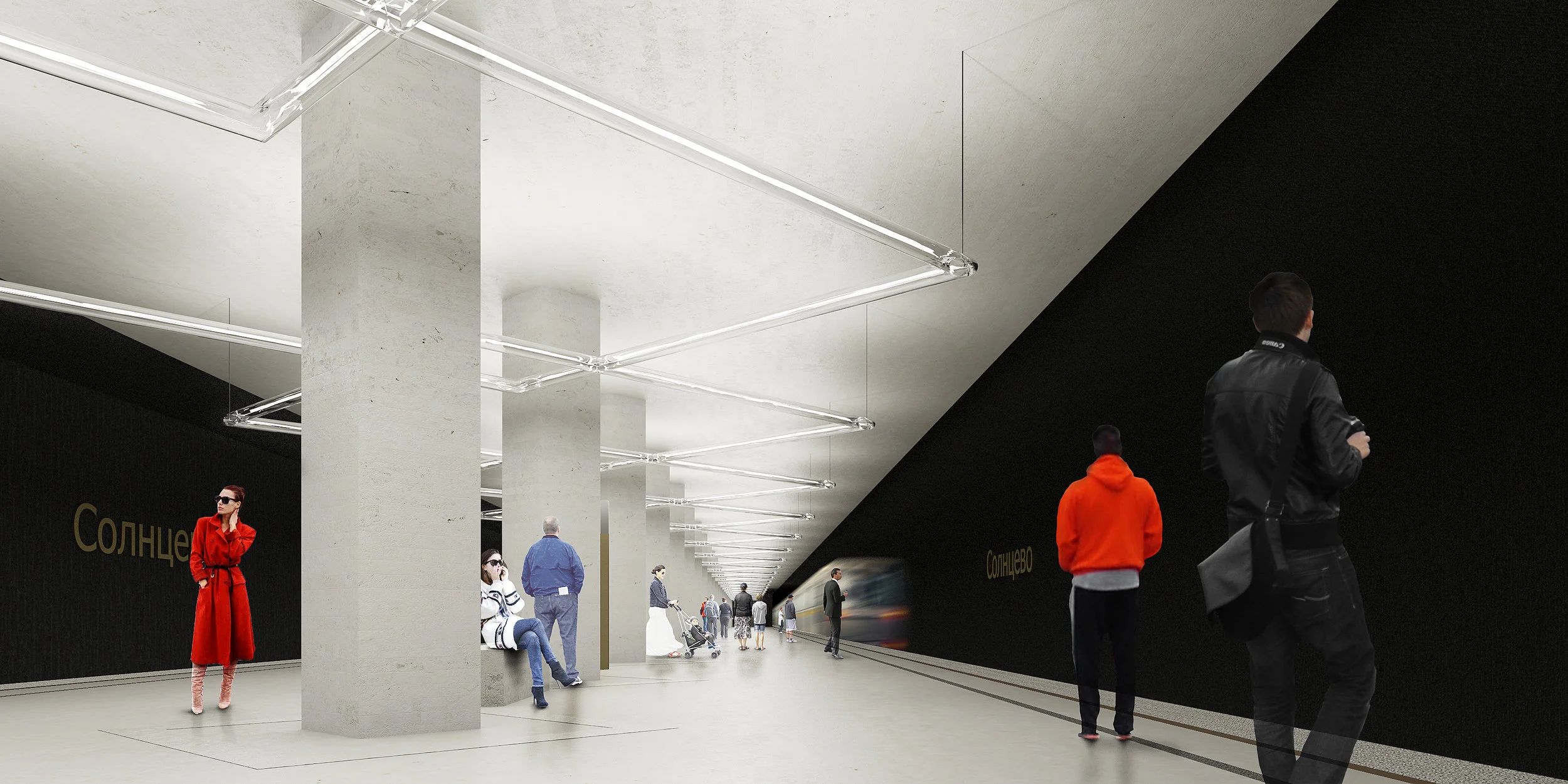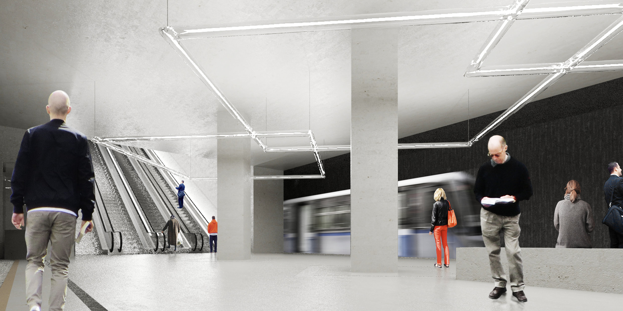 The dark surfaces of the track area serve as a backdrop to the central function of the station, the arrival and departure of trains. White stone clad columns, ceilings and floors celebrate the double span structure of the station. The columns are rotated from orthogonal and a single light source traces the diagonal produced by this rotation and provides light that recalls the sparkle of the chandeliers of the historic Metro stations.