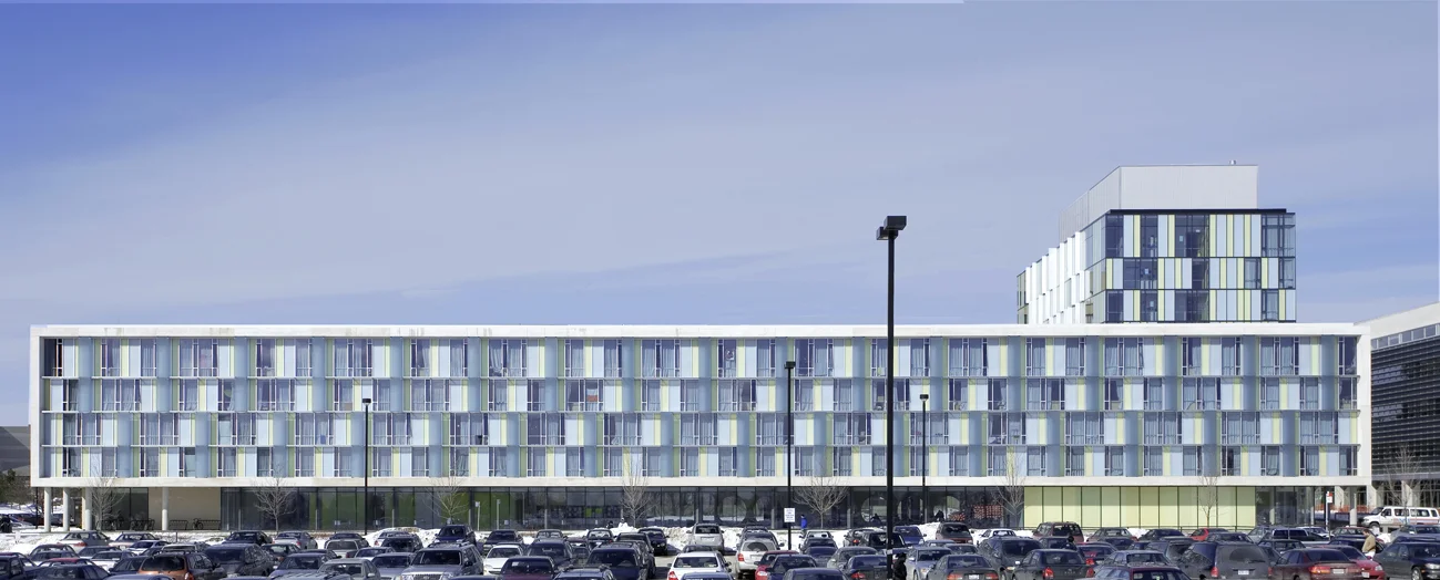This project realized opportunities for sustainable solutions through the following design initiatives: the in-slab heating and cooling uses the concrete structure as a heat sink, a high-performance curtain wall is fitted with sunshade devices, all mechanical exhausts are fitted for heat recovery, and the building has a planted green roof. The Pond Residence provides 440 beds distributed through adjoining two-bedroom suites that share a washroom and a small kitchen area.