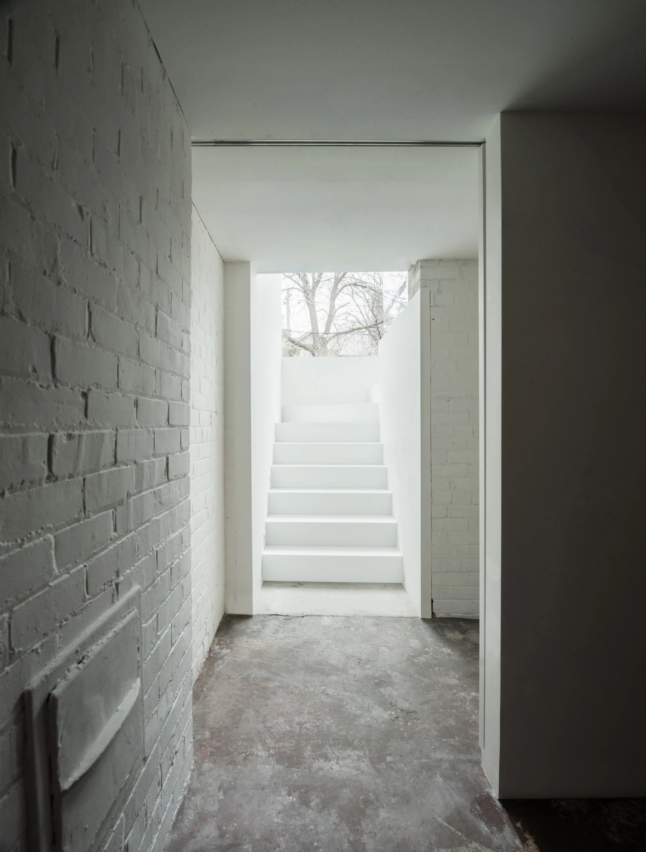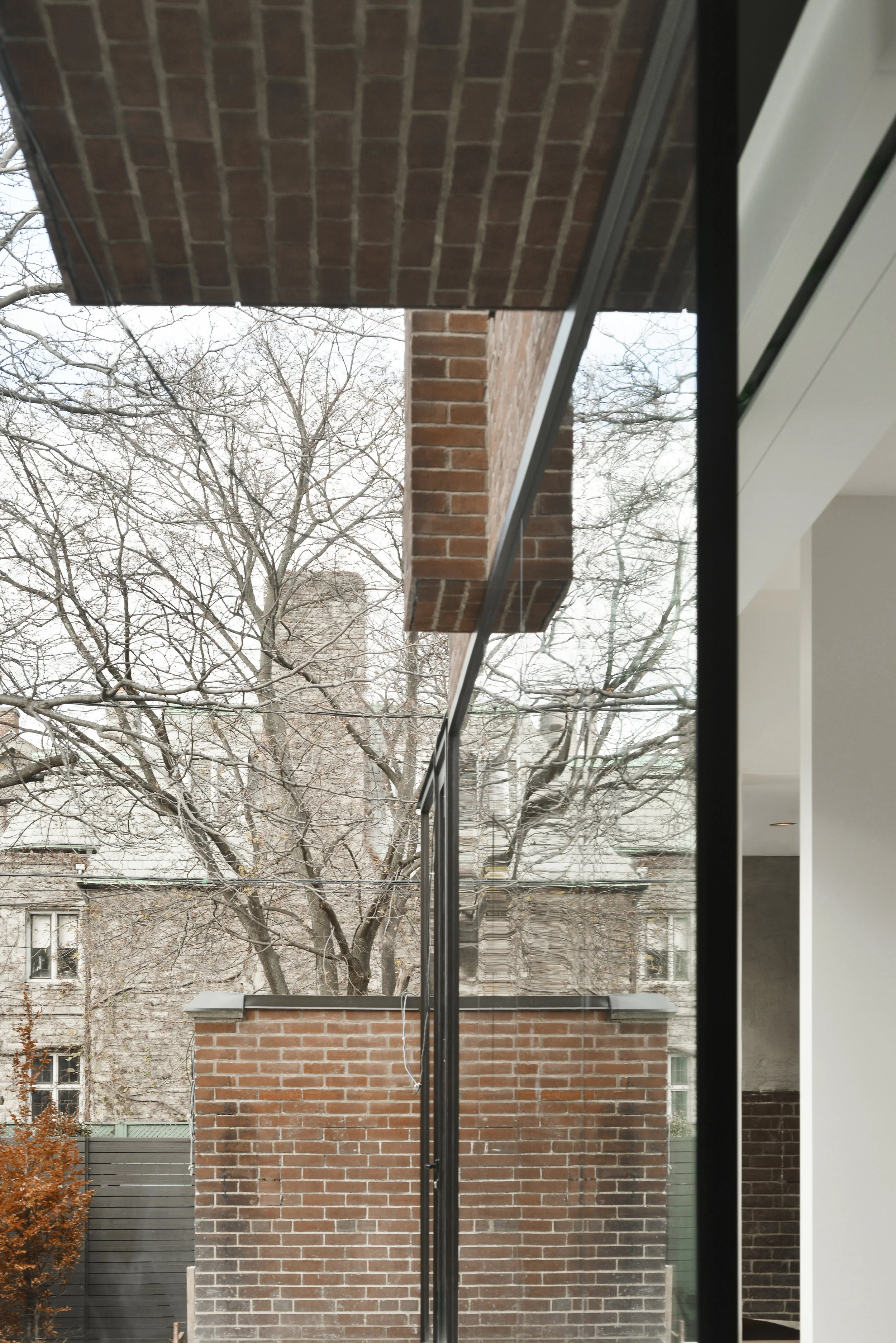 The central surgical act is the excision of the exterior brick wall at the back of the house. This sharp delineation allows the robust articulated brick exterior to be retained, while the interior becomes reductionist in its focus on essential elements of light, proportion and volume. This ‘shearing off’ is expressed through new brick soffits that visually resolve the chimney and second floor stair whereby they float above the sharp steel line between original and new. The lower part of the brick exterior walls are replaced with super scaled glazed walls that contribute a new connectedness to the site. A new concrete plinth creates a new two-sided courtyard that aligns the outdoor space with the interior. Within, sharply contrasting elements include razor thin-aluminum fins that notionally cut through restored crown moldings and wainscoting to achieve pristine full-height openings that connect the more formal rooms of the ground floor.