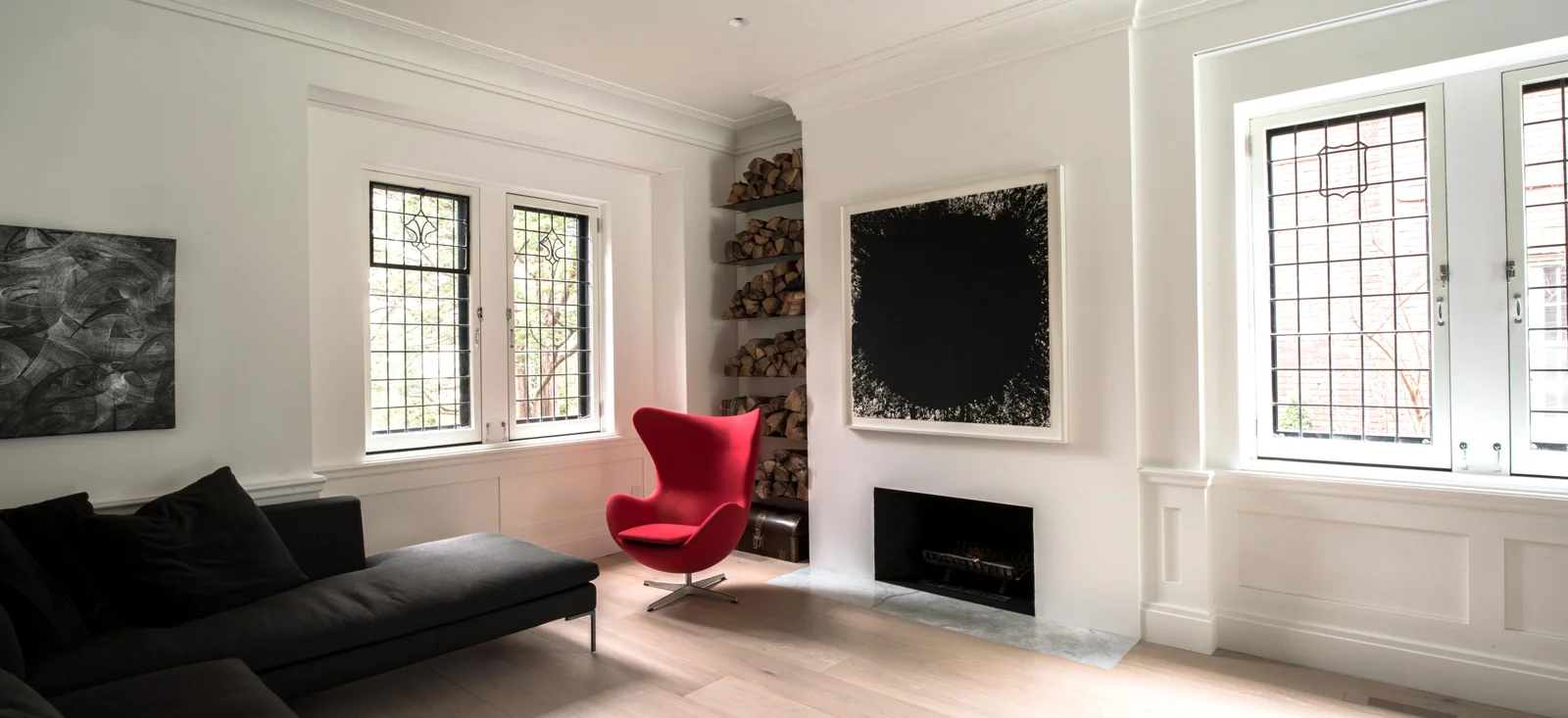 Throughout the house, the beautifully constructed layers of the original structure are revealed and celebrated. The team was careful to keep the surface record of the house’s auspicious history, achieving a light-filled and well-proportioned balance between past and present. Certain features are stripped back to the bare brick walls, with traces of the past left behind as evidence that the building has been cared for and adapted over the years, with each generation adding its own layer to a unique history. The most expressive example is the north gallery wall, a palimpsest of previous openings and floor levels. The renovation leaves untouched brick joist pockets, a jack arch, a black brick stringcourse, and exposes the lesser-valued yellow brick of an unearthed original rising wall. This historical narrative is washed in light by the over-scaled transparent openings of the modern intervention.