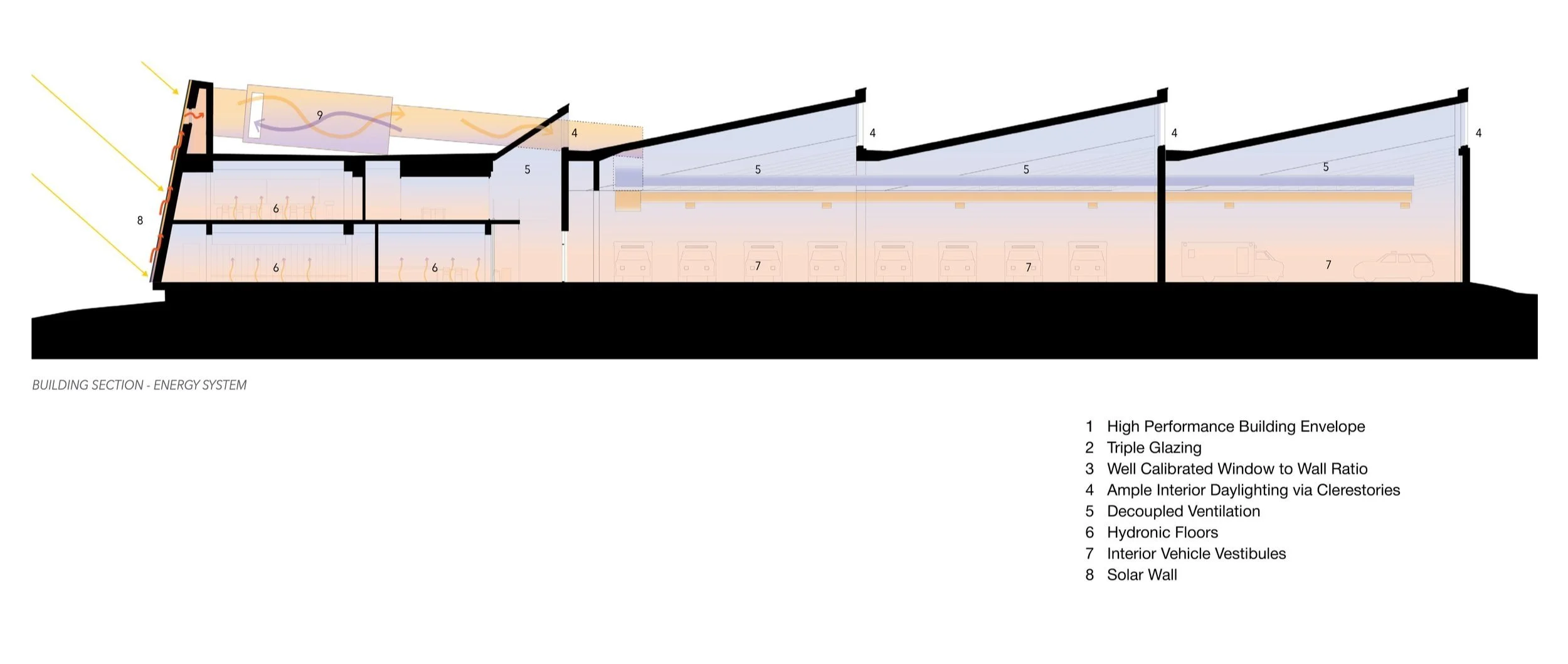 The DNA of the building is informed by the tilt of the south-facing “solar wall” which conserves 15% of the entire building’s energy. The building is on track to achieve an energy use intensity (EUI) of 139, a remarkably low number for this type of facility. The project is a signal to designers and clients that it is possible to have provocative design informed by energy systems.